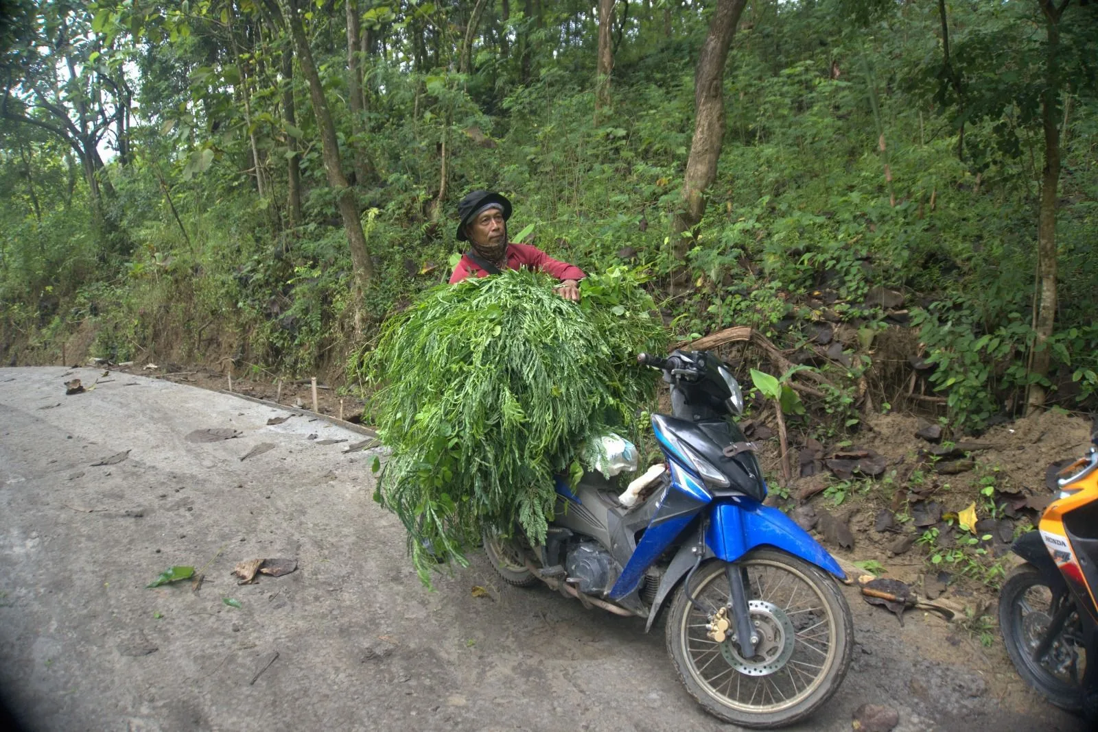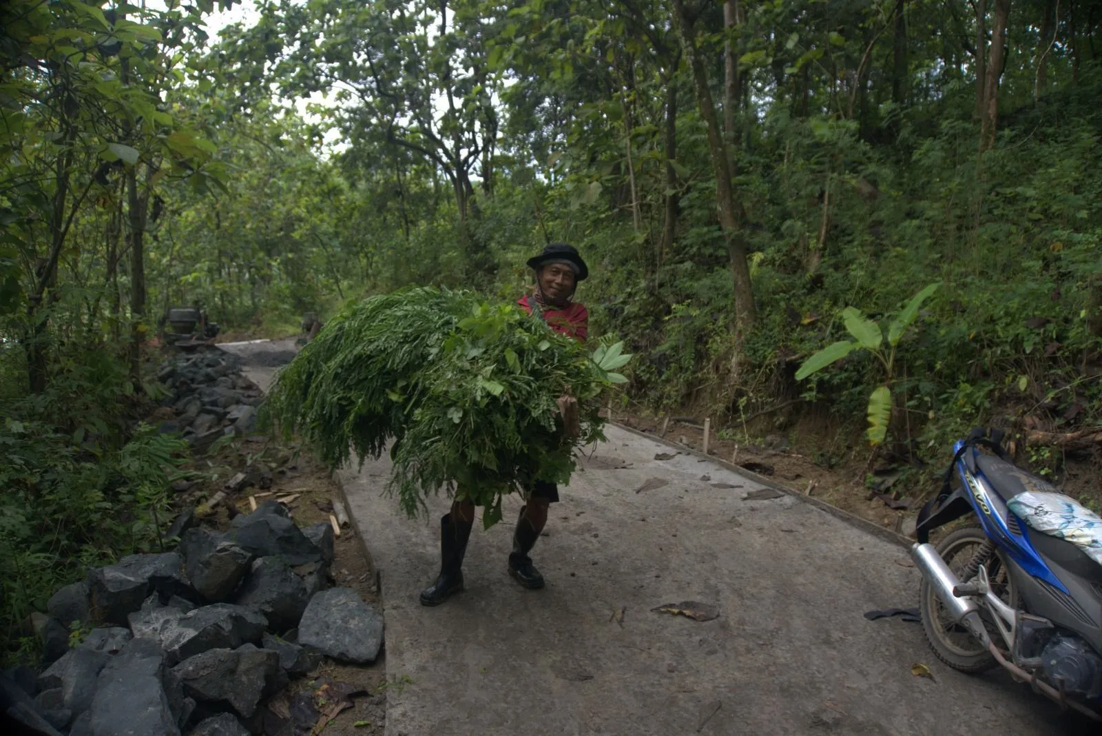 Dulu, mencari pakan ternak di area perbukitan atau ladang yang jauh merupakan tantangan berat, terutama jika medan berlumpur. Namun kini, kondisi jalan yang sudah bagus memungkinkan Kantoro membawa pakan dalam jumlah banyak menggunakan kendaraan bermotor.