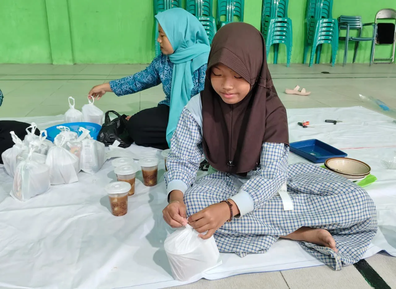 Ia adalah Kila (11), putri dari salah satu anggota penggerak PKK Desa Cikuya. Tanpa rasa canggung, bocah kelas 5 SD ini terlihat riang gembira ikut menyiapkan paket takjil sejak siang hari di teras Kantor Desa.