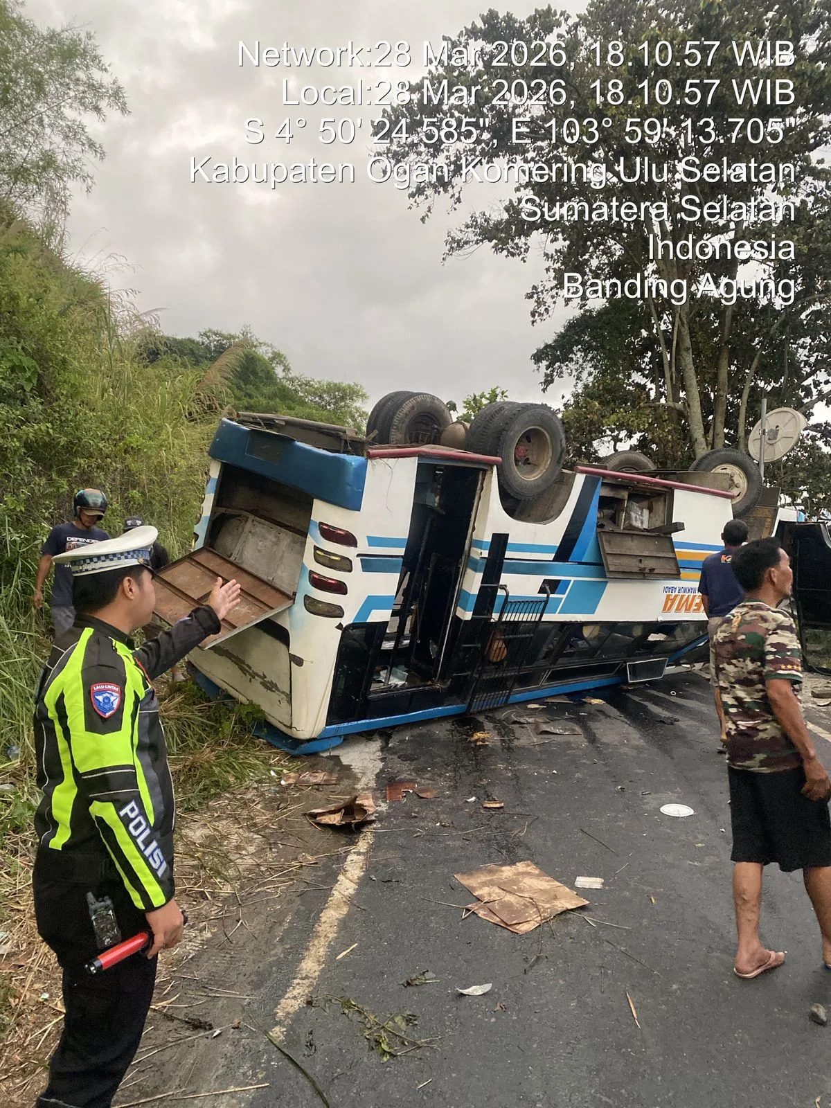 OKU SELATAN, Faktadetiknews — Kecelakaan lalu lintas tunggal melibatkan satu unit Mitsubishi Micro Bus berpenumpang 28 orang terjadi di Jalan Raya Banding Agung–Simpang Pusri, kawasan tepian Danau Ranau, Desa Subik, Kecamatan Buay Pematang Ribu Ranau Tengah (BPRRT), Kabupaten Ogan Komering Ulu Selatan, Sabtu (28/3/2026) sekira pukul 17.00 WIB.Seluruh penumpang mengalami luka-luka, dengan rincian 25 orang luka ringan dan tiga orang mengalami luka berat. Tidak terdapat korban jiwa dalam peristiwa tersebut.Kendaraan yang terlibat merupakan Mitsubishi Micro Bus warna putih bernomor polisi BE 7403 BU yang dikemudikan oleh K (38), warga Kabupaten OKU Timur.Kendaraan tersebut melaju dari arah Banding Agung menuju Simpang Pusri dengan membawa penumpang penuh.Berdasarkan hasil olah TKP dan keterangan saksi, kecelakaan terjadi saat kendaraan melintasi ruas jalan menanjak dan menikung.
