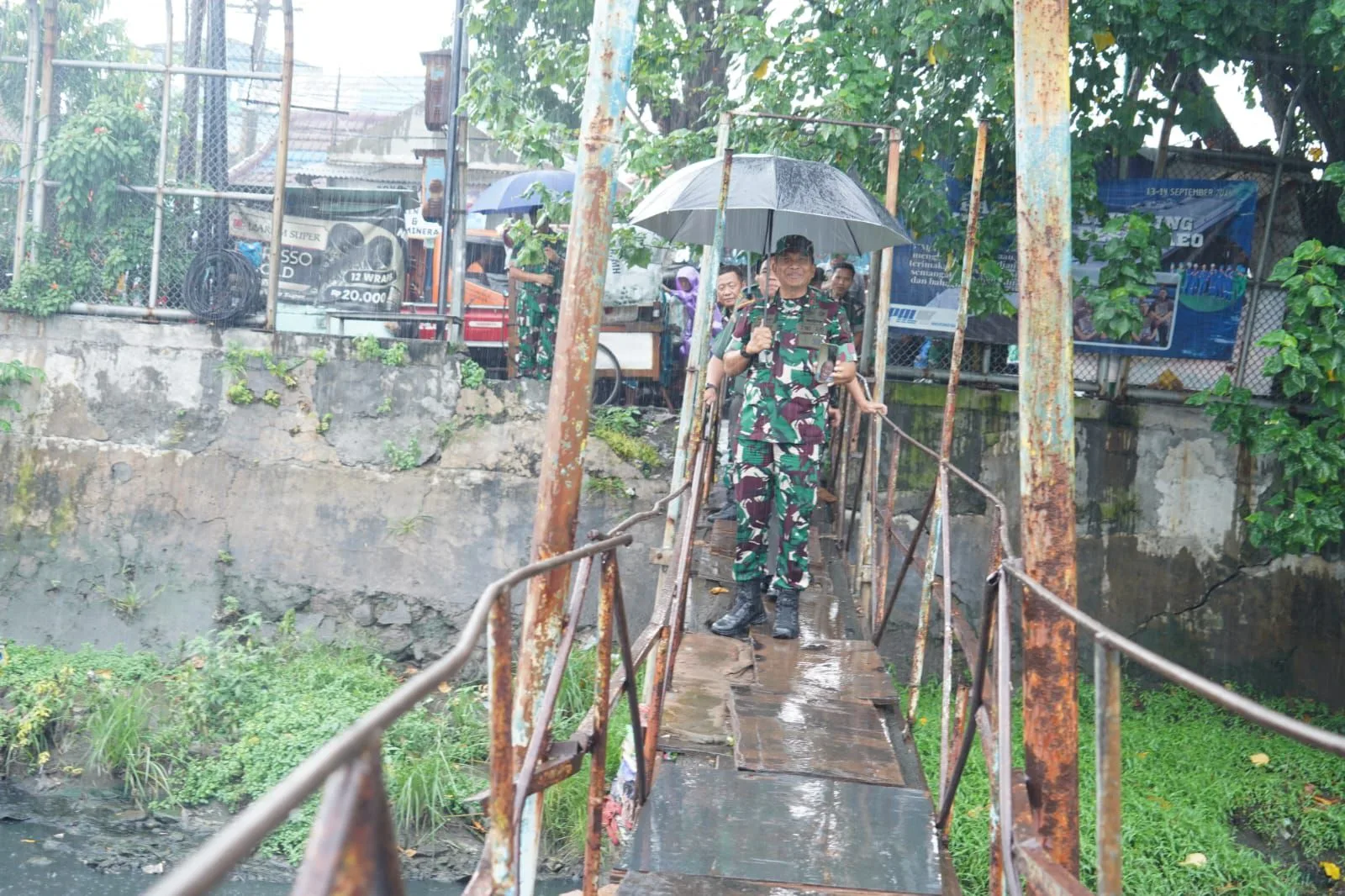 Komandan Korem 084/Bhaskara Jaya, Brigjen TNI Dany Alkadrie, meninjau langsung kondisi jembatan pejalan kaki di Jalan Genting Kalianak, Kelurahan Genting Kalianak, Kecamatan Asemrowo, Kamis (22/01/26).