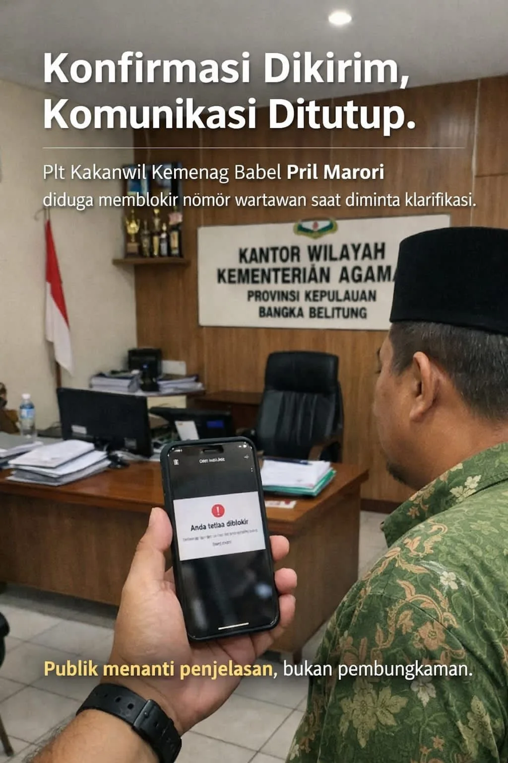 Pelaksana Tugas sehari-hari (Plt) Kepala Kanwil Kemenag Babel, Pril Marori, yang juga menjabat sebagai Kepala Bagian Tata Usaha (Kabag TU), terindikasi menutup jalur komunikasi setelah permintaan klarifikasi resmi dilayangkan. Rabu (18/2/2026).