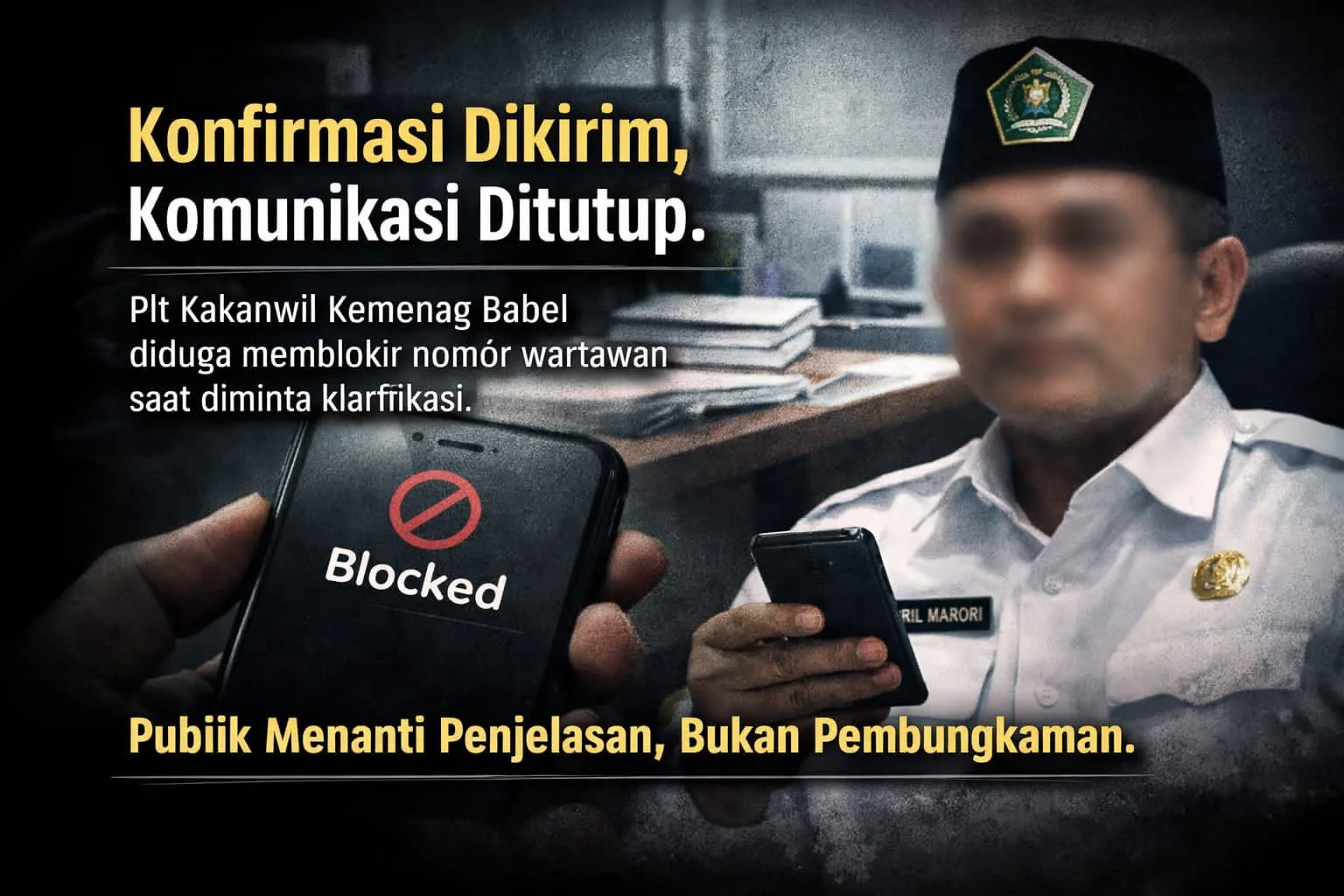 Sejak Sabtu, 14 Februari 2026, nomor wartawan redaksi tidak lagi dapat tersambung ke nomor pribadi yang bersangkutan. Situasi ini terjadi tak lama setelah redaksi mengirimkan permintaan konfirmasi tertulis terkait pemberitaan dugaan pengkondisian jabatan Kepala Kanwil, pelaksanaan asesmen internal, serta sejumlah isu tata kelola proyek di lingkungan Kanwil Kemenag Babel.