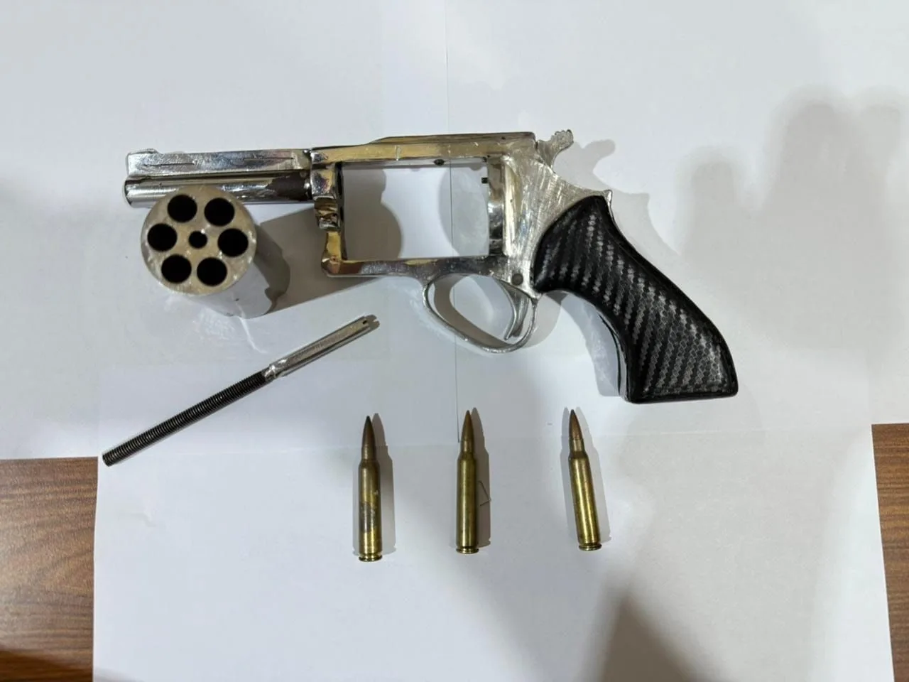 Berdasarkan informasi warga, pelaku diketahui kembali ke tempat kontrakannya. Petugas kemudian melakukan penggeledahan dan menemukan satu pucuk senjata api rakitan jenis revolver beserta tiga butir amunisi yang disembunyikan di dalam kotak speaker kayu kecil.