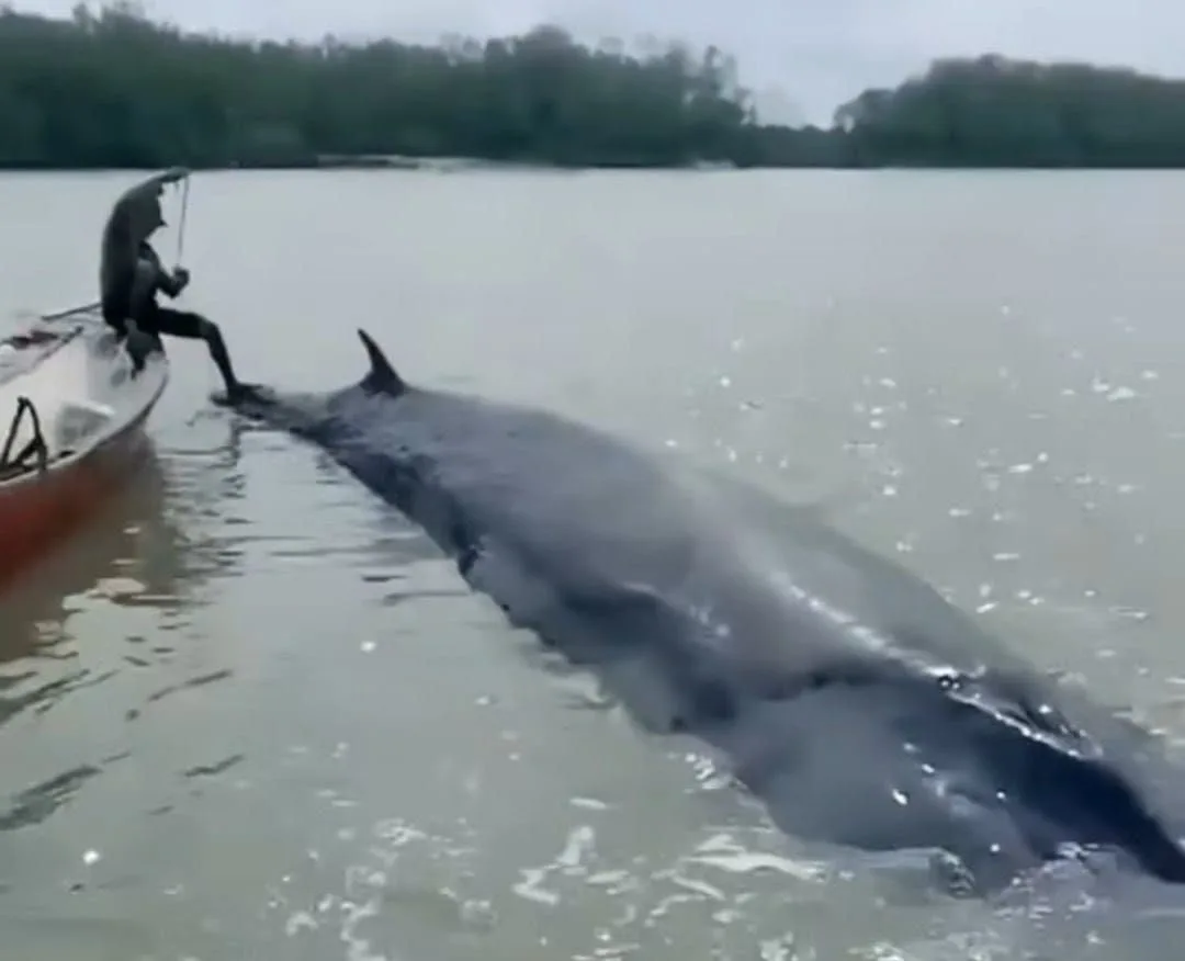 Fenomena langka ini sontak menyedot perhatian masyarakat. Mamalia laut tersebut terlihat terjebak di perairan dangkal sehingga tidak mampu bergerak kembali ke habitat asalnya.