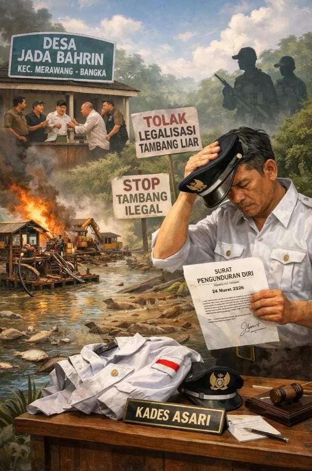 BANGKA, Faktadetiknews — Keputusan mengejutkan datang dari Kepala Desa Jada Bahrin, Kecamatan Merawang, Kabupaten Bangka. ASARI resmi menyatakan pengunduran dirinya dari jabatan kepala desa, menyusul konflik berkepanjangan terkait aktivitas tambang timah ilegal yang terus berlangsung di kawasan hutan desa dan Daerah Aliran Sungai (DAS) Jada Bahrin.