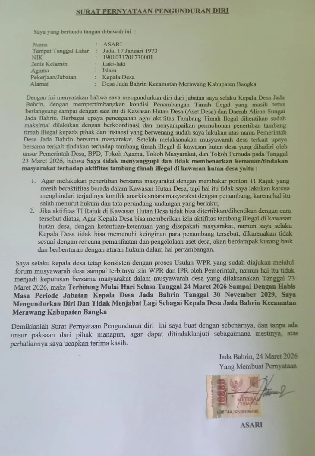 Surat pengunduran diri tersebut dibuat pada 24 Maret 2026 dan berlaku sejak tanggal yang sama hingga akhir masa jabatannya pada 30 November 2029. Dalam pernyataannya, ASARI menegaskan bahwa keputusan itu diambil tanpa paksaan, melainkan sebagai bentuk sikap tegas atas prinsip hukum dan upaya menjaga kelestarian lingkungan desa.