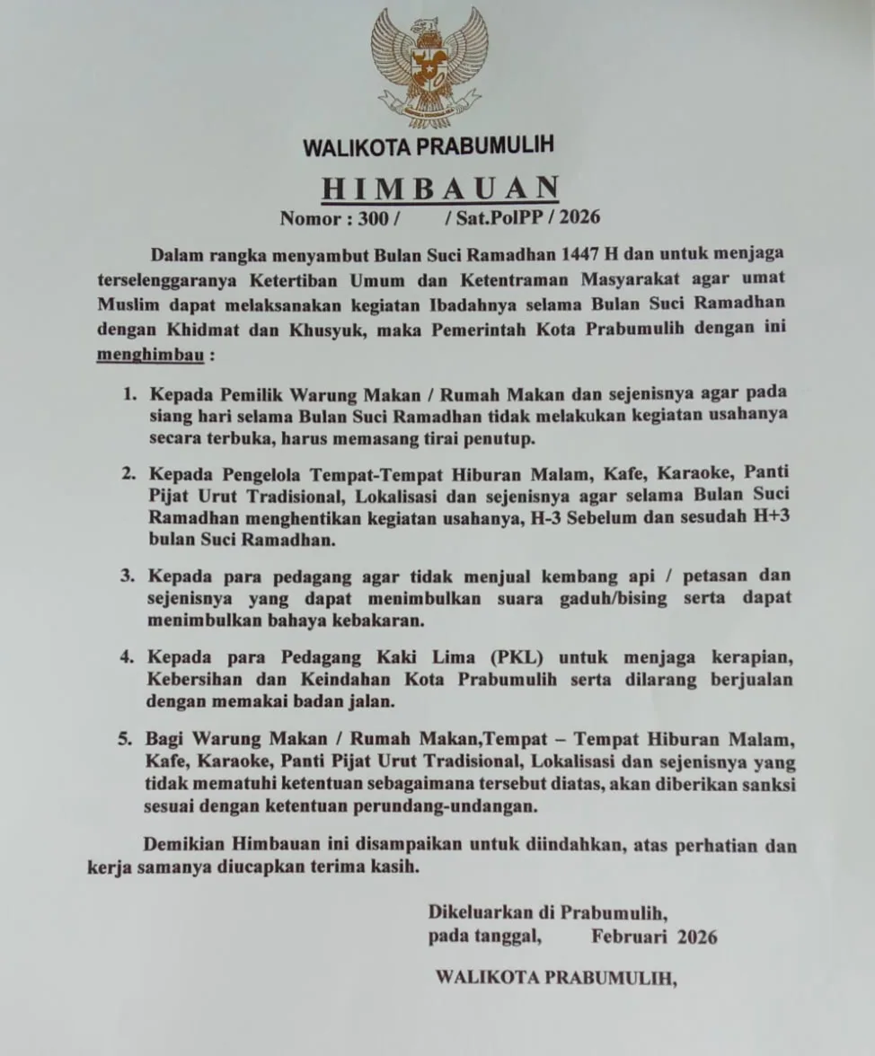 Sebelumnya, Wali Kota Prabumulih melalui Satpol PP telah mengimbau agar seluruh kegiatan hiburan malam ditutup sementara mulai H-1 menjelang Ramadhan dan baru diperbolehkan kembali beroperasi pada H+2 setelah Idulfitri.