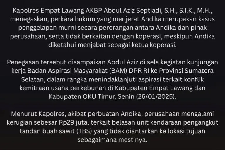EMPAT LAWANG, Faktadetiknews. — Narasi dugaan penggelapan aset ratusan miliar rupiah oleh Ketua Koperasi Lintang Pinang, Andika, yang sebelumnya beredar di publik, kini dipatahkan oleh keterangan resmi pihak kepolisian. Kapolres Empat Lawang, AKBP Abdul Aziz Septiadi, mengungkapkan bahwa laporan yang masuk terhadap Andika hanya terkait dugaan penggelapan Tandan Buah Segar (TBS) senilai Rp 29 juta.