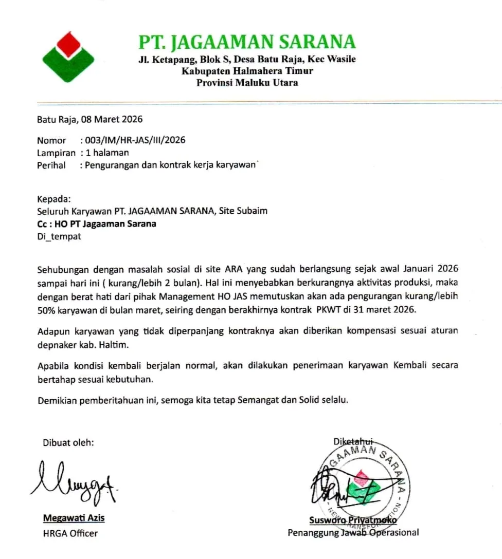Wasile, faktadetiknews.biz.id – PT Jagaaman Sarana mengumumkan rencana pengurangan karyawan di Site Subaim, Kecamatan Wasile, Kabupaten Halmahera Timur. Kebijakan tersebut disampaikan melalui surat resmi perusahaan tertanggal 8 Maret 2026.