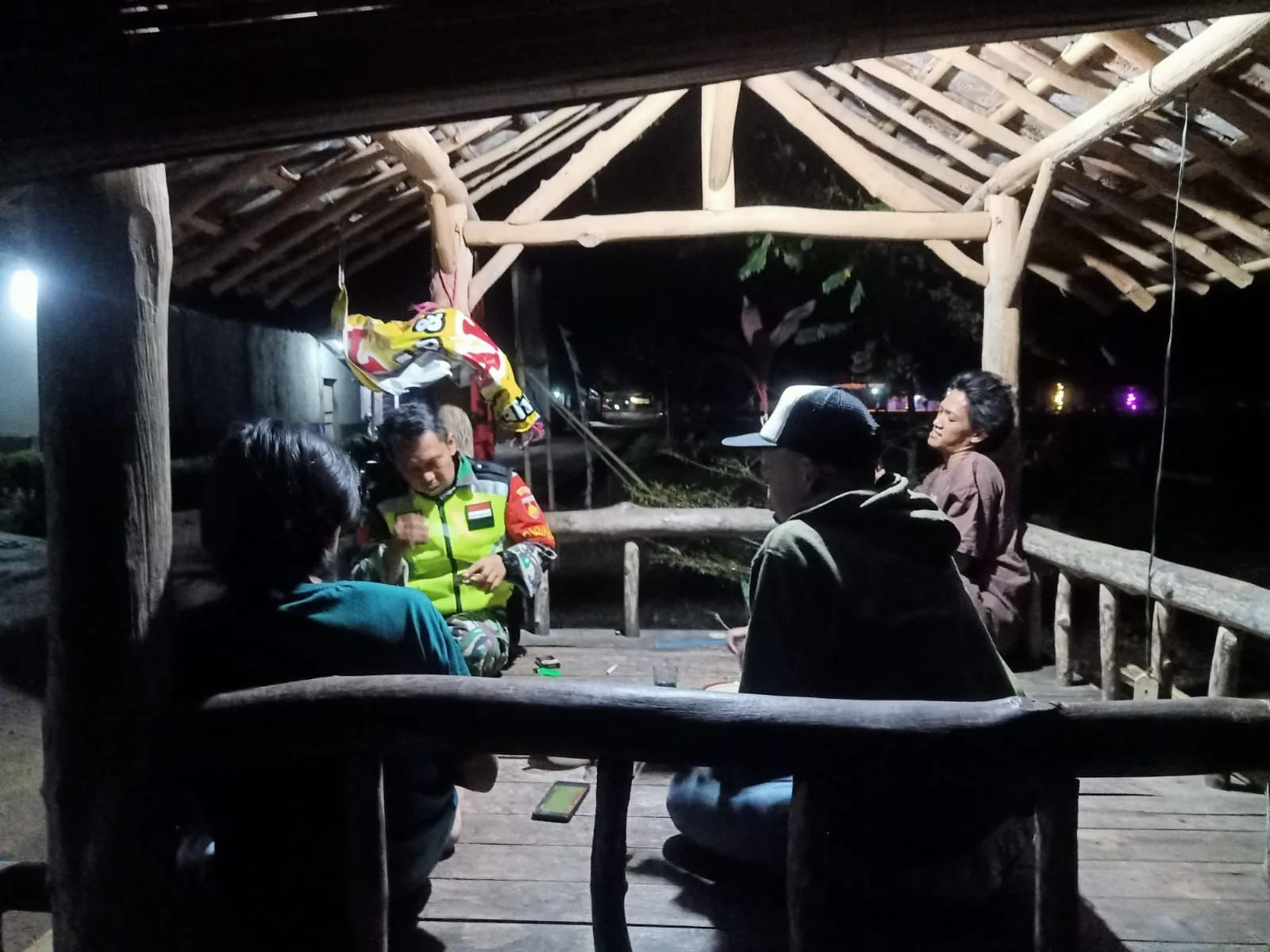 Salah satu anggota Satgas TMMD, Koptu Hendra, tampak hadir dan ikut serta melaksanakan kegiatan Ronda Malam (Pos Kamling) bersama warga Desa Cikuya, Kecamatan Banjarharjo, Kabupaten Brebes.