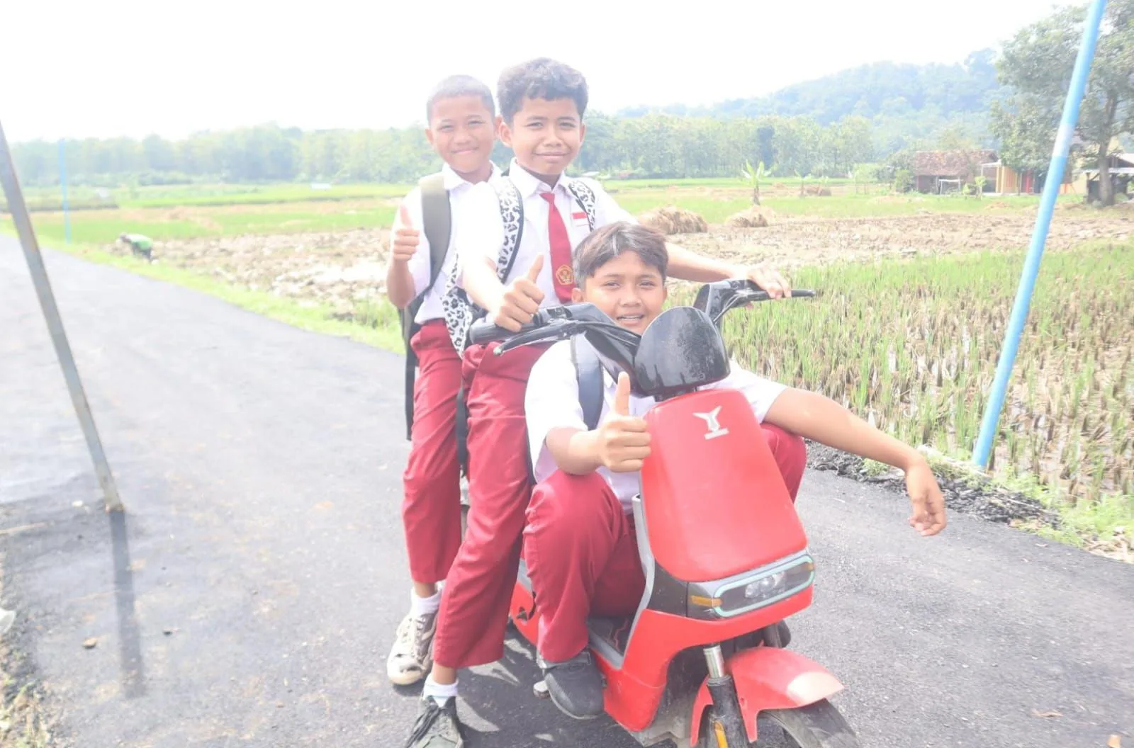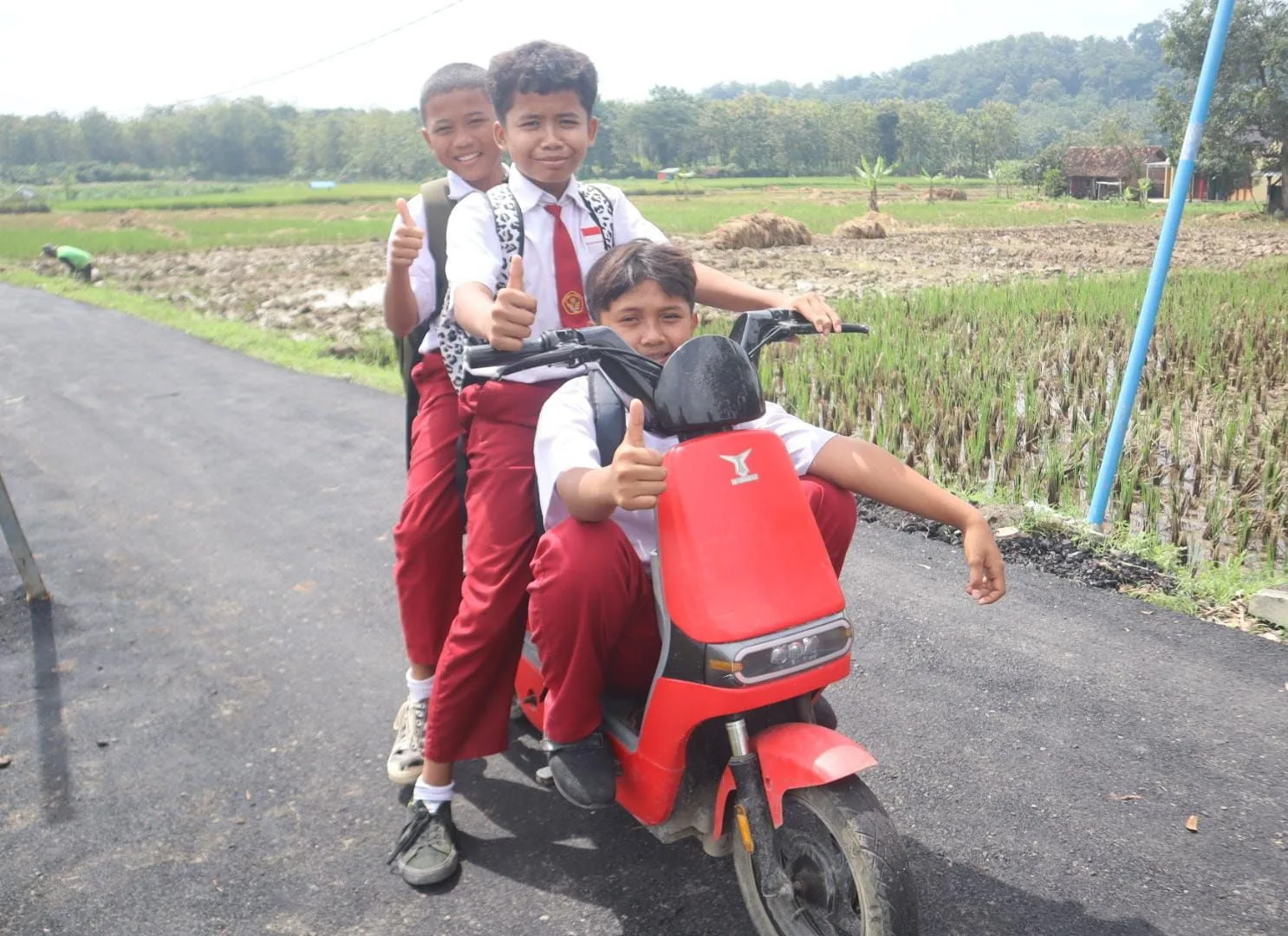 “Jalannya baru, Pak! Jadi bisa main di sini. Dulu susah kalau mau naik sepeda, banyak batu dan lubang,” seru salah satu siswa SD yang tengah asyik berboncengan dengan temannya menggunakan sepeda listrik.