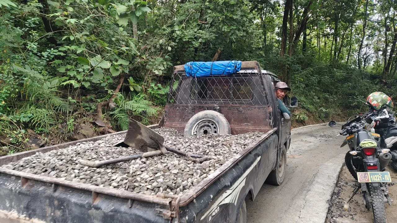 Batu split yang diangkut Yudi akan digunakan untuk mengeraskan jalan desa, yang diharapkan nantinya dapat membuka akses ekonomi lebih luas bagi warga Desa Cikuya setelah program TMMD ini tuntas.