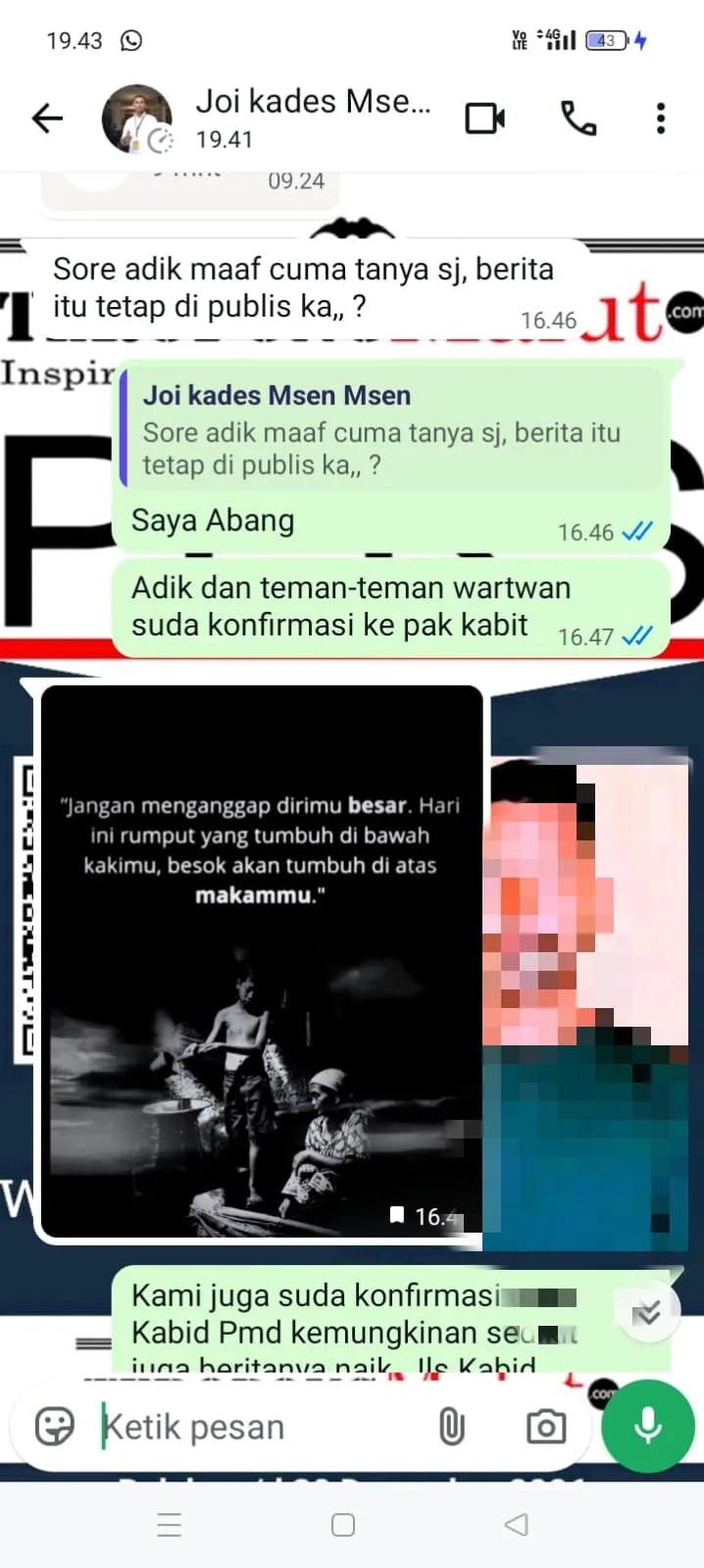 Pesan tersebut berupa gambar berisi kutipan nasihat yang beredar melalui aplikasi WhatsApp. Dalam pesan tersebut tertulis kalimat, “Jangan menganggap dirimu besar. Hari ini rumput yang tumbuh di bawah kakimu, besok akan tumbuh di atas makammu.”