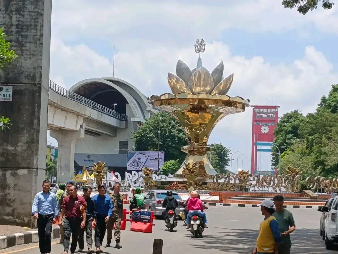 Ikon paling dekat dengan pandangan pengguna jalan saat ini adalah Bundaran Air Mancur Tugu Cempako Telok yang baru saja diresmikan kembali setelah melalui revitalisasi besar. Di atasnya tampak jalur LRT yang melayang, sementara di kejauhan berdiri kokoh Jembatan Ampera yang menjadi simbol kebanggaan warga Palembang.